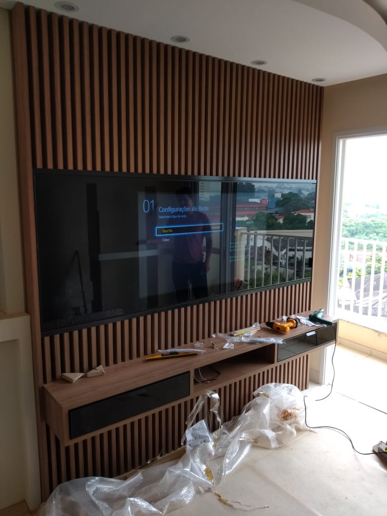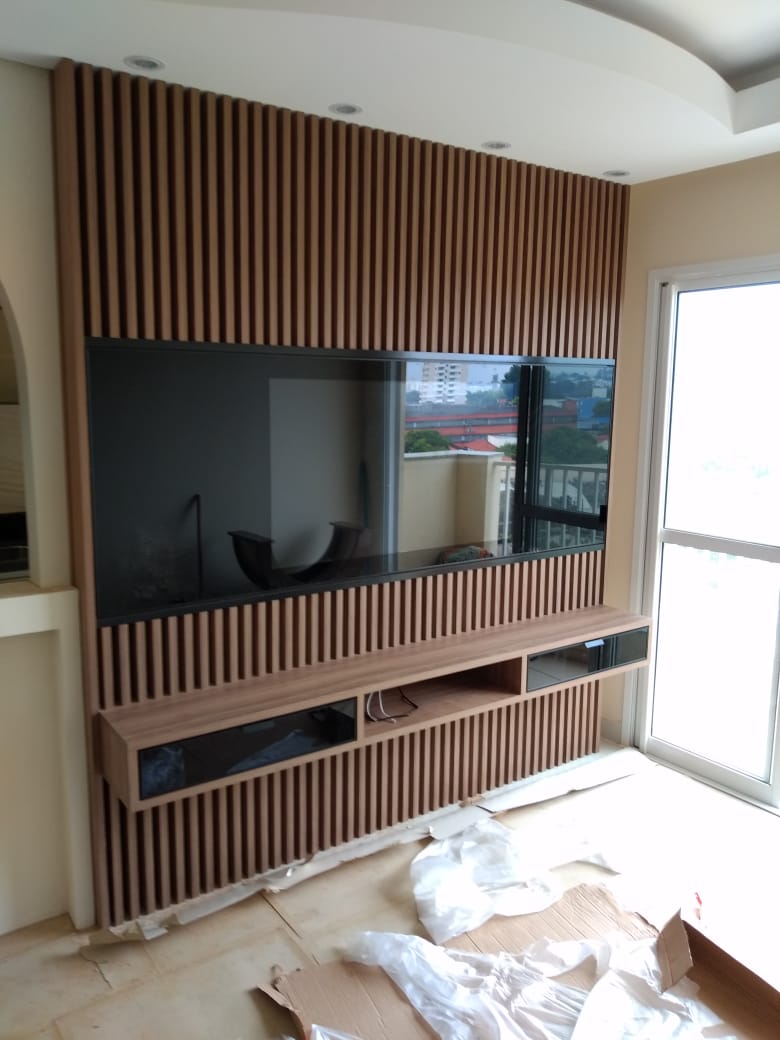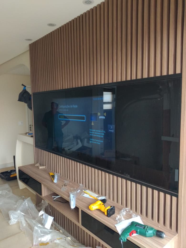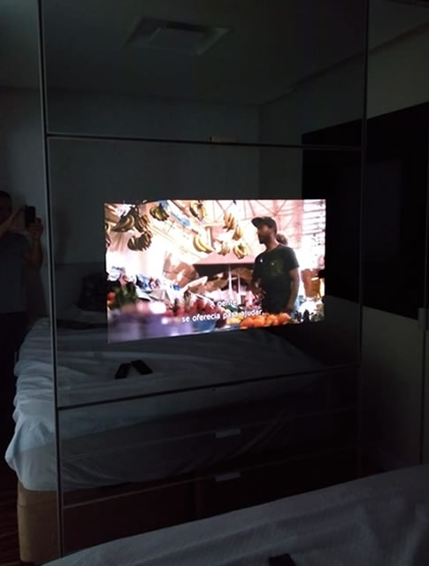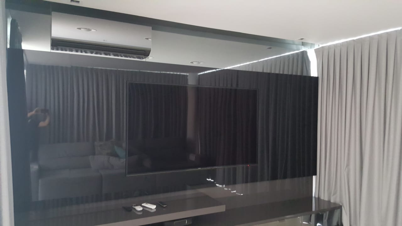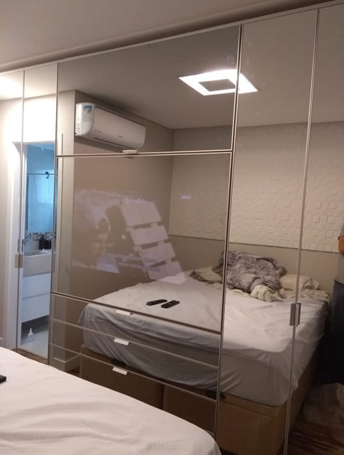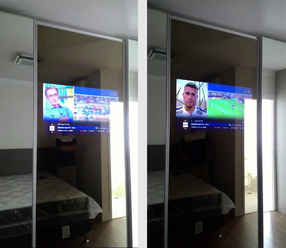 Com a possibilidade de usar Vidros Refletivos que se transformam em acabamentos espelhados, podemos usalos na aplicação em portas de correr com TV Embutida, e Painéis para Home.